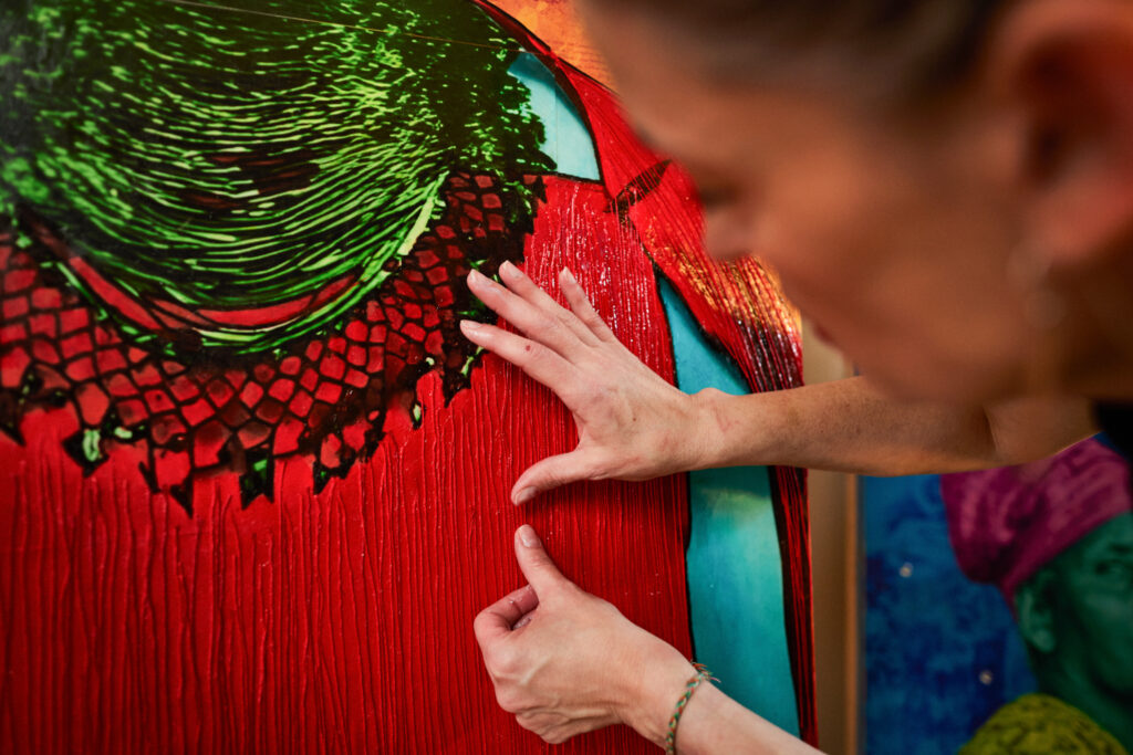 This is when pieces start to become alive. Textural features are incorporated, such as sculpture or thread. Additional markings are applied to bring story and context to the image. Colors become richer, more cohesive, and the piece comes together as a whole. A title is chosen.